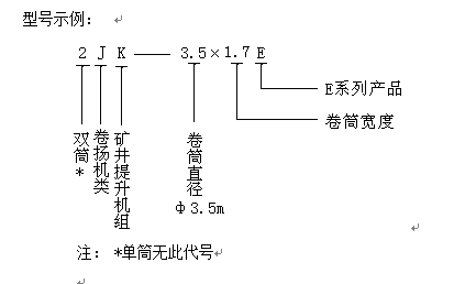 本產(chǎn)品執(zhí)行中華人民共和國機械工業(yè)部標準JB/T2646-1992《單繩纏繞式礦井提升機型式基本參數(shù)與尺寸》,其型號表示方法符合中華人民共和國機械工業(yè)部JB1604—1998《礦山機械產(chǎn)品型號編制方法》的規(guī)定。